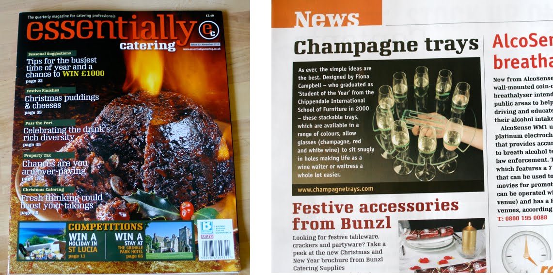Fiona’s latest range takes her business in a new direction. She has designed a series of safe drinks trays that eliminate the problem of dropping glasses while serving champagne or wine.